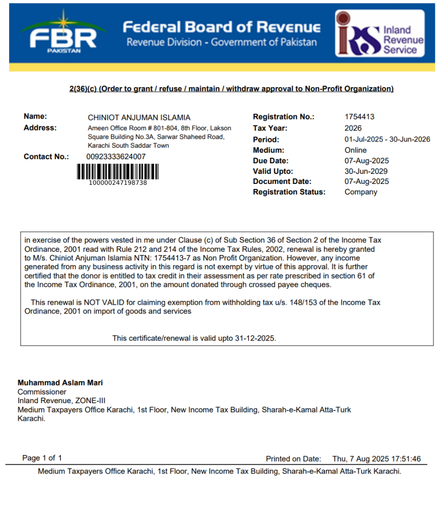 FBR Tax Exemption Certificate (All funds donated to Chiniot Anjuman Islamia & its projects are exempted from tax)